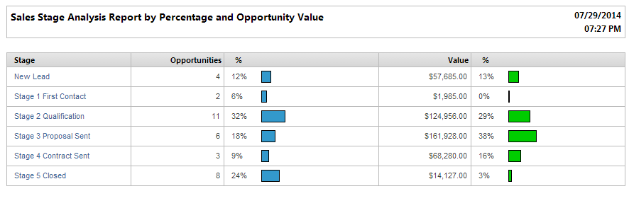 Opportunity amounts and percentage of opportunities at different stages in the sales process. |