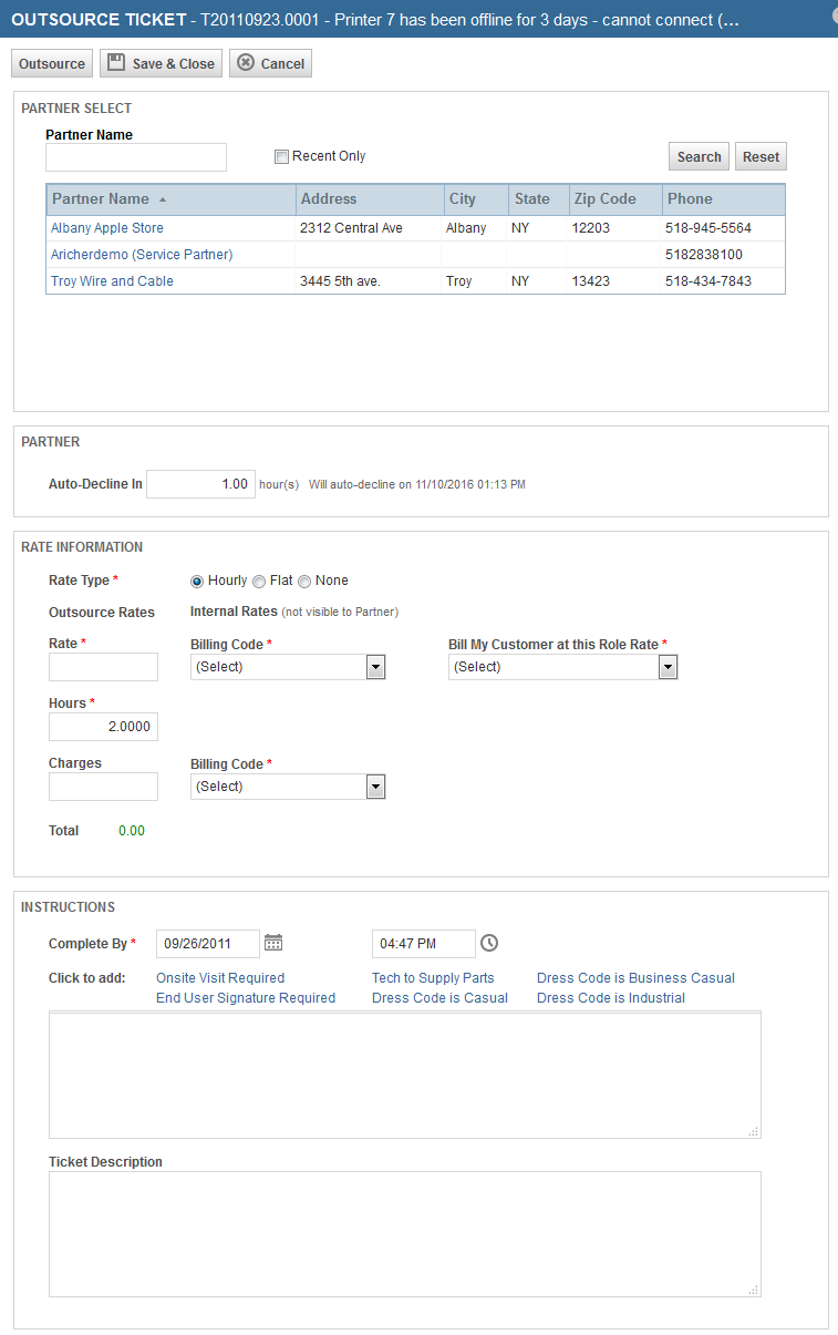 To outsource a ticket, you will select a partner and specify the outsourcing terms and internal billing information on the Outsource Ticket page.