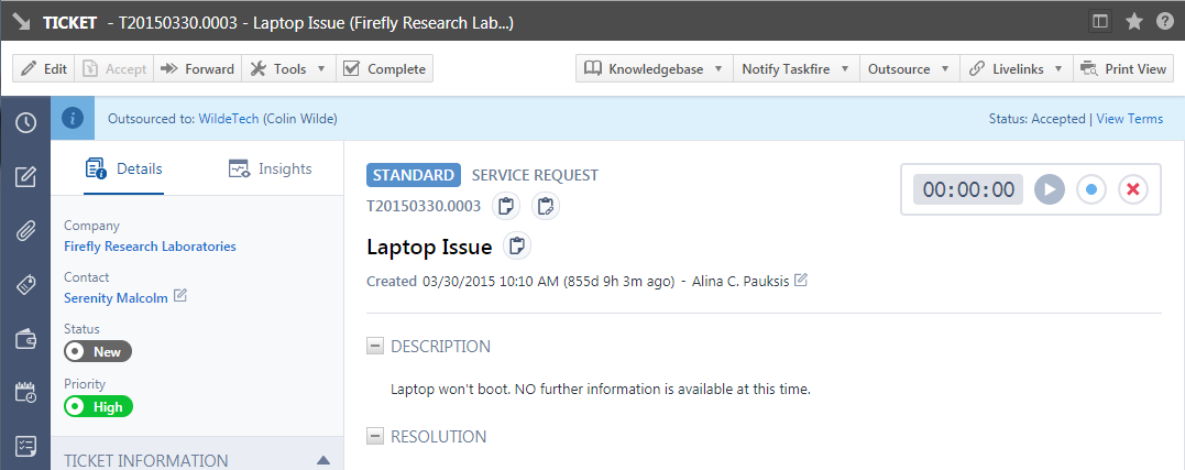 - The new ticket is linked to and synched with your original ticket. Notes, attachments, and time and charge entries added by both you and the service partner are visible on both tickets. Refer to What happens while the ticket is outsourced?.