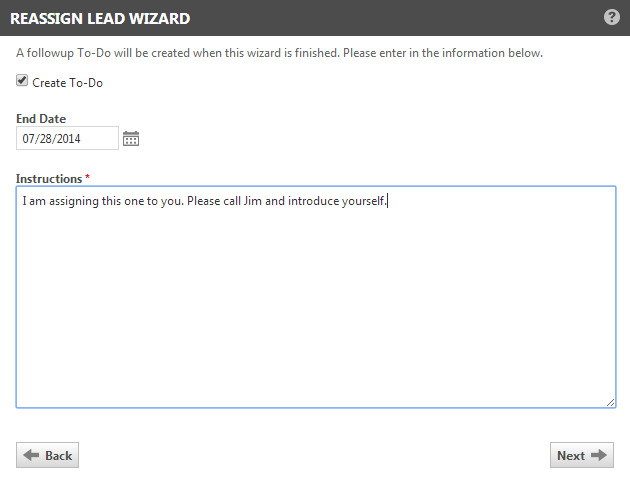 - To create a to-do for the newly assigned resource, complete the Instructions field, and edit the Due Date, if desired. Click Next.
