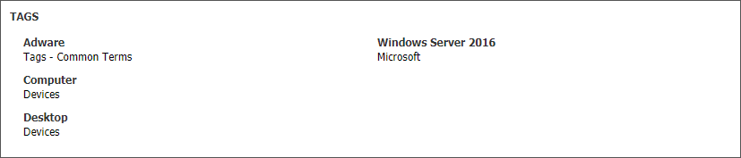 The Tags section lists all of the tags currently associated with the ticket, along with the categories to which the tags belong. |