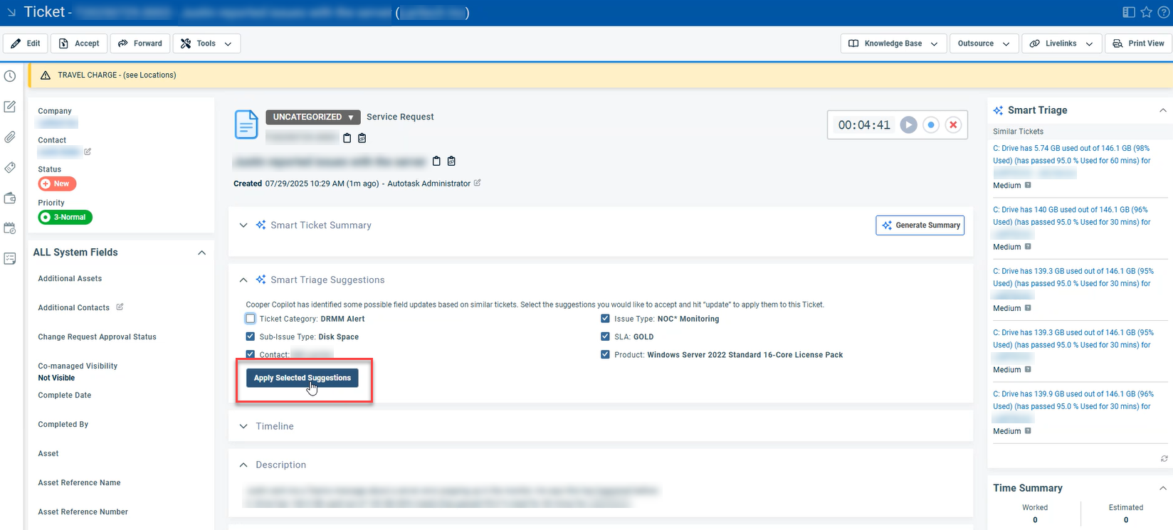 To update the ticket with the suggested changes, click Apply Selected Suggestions. The suggested changes are applied to the ticket. You can view the Ticket History to see what changes were applied. Refer to Viewing the ticket history.