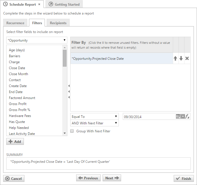 On this tab, you create filters for the report. If you set up a recurring schedule on the previous tab, you may want to use a dynamic date filter to get new data since the last time the report was run.