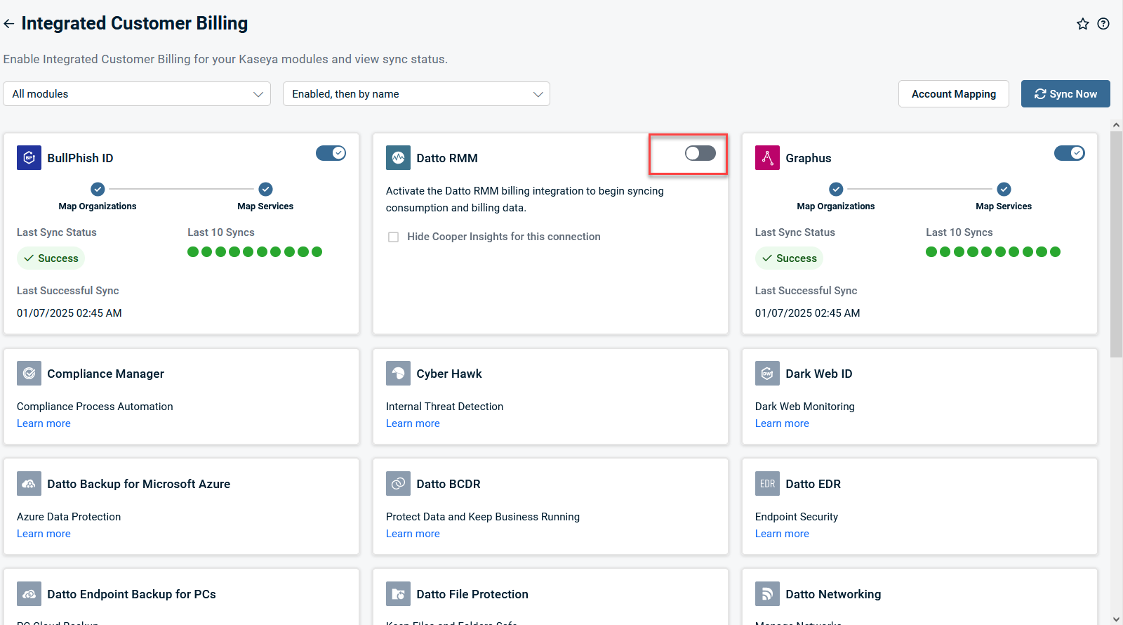 EXAMPLE In the example followed in the rest of this article, an RMM customer is integrating their RMM billing flow with Autotask. This customer will toggle the slider to enable the Datto RMM module as shown below.