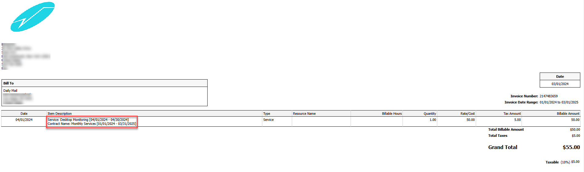 After you associate the billing data with your Autotask organizations and map them to recurring service contracts, you can then bill your customer a single, combined Autotask invoice that contains all of your connected Kaseya modules.