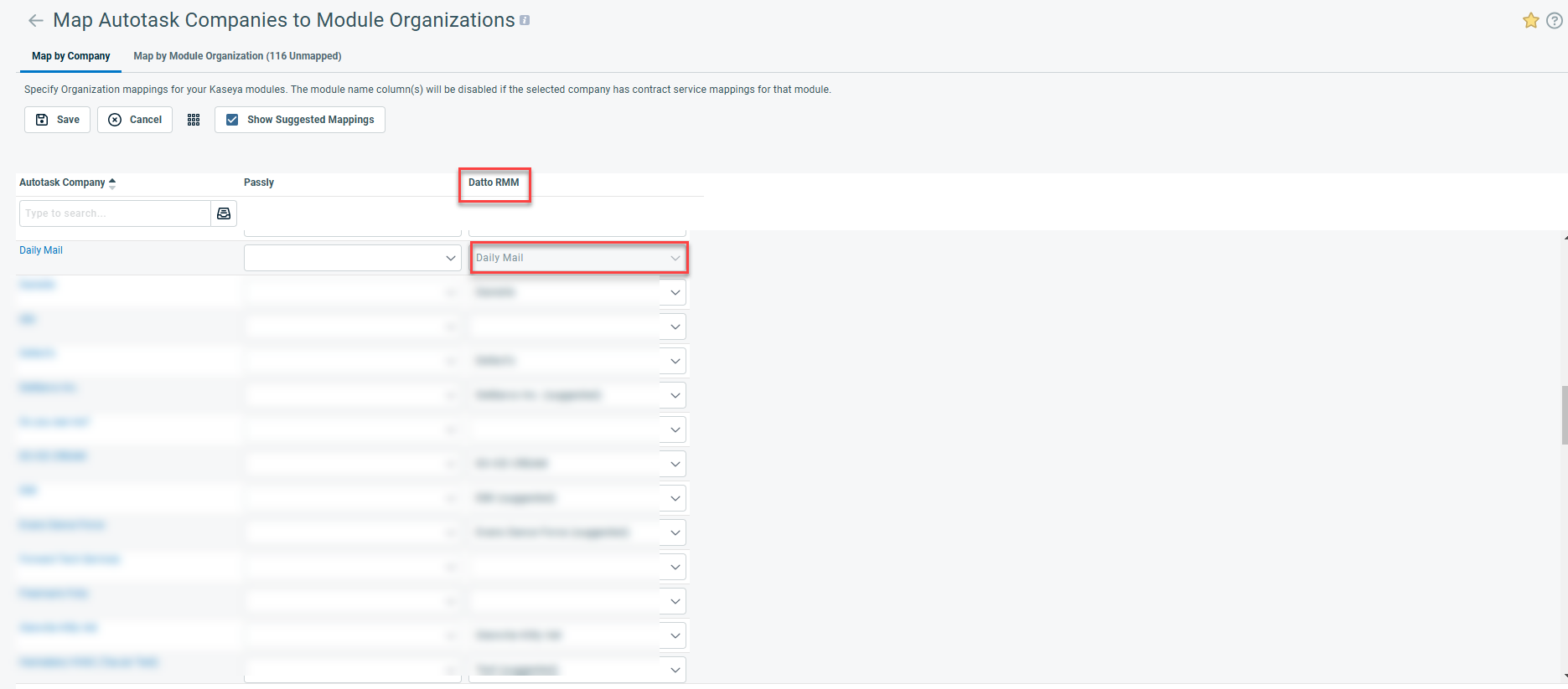 EXAMPLE For our RMM example customer, the Autotask and RMM organizations have the same name. Daily Mail has been selected for the Autotask organization and Daily Mail has been selected for the RMM organization.