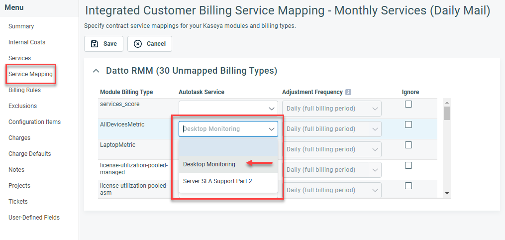 Step 3: Map KaseyaOne module billing types to Autotask services in a recurring service contract