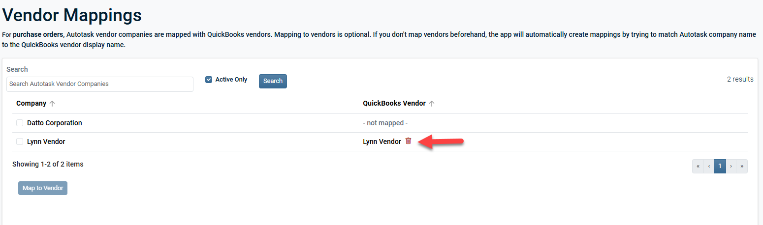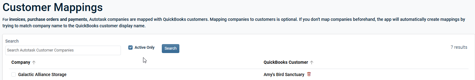 The Customer Mappings and Vendor Mappings pages are dedicated to mapping Autotask organizations and vendors to QuickBooks Online. Customer mappings affect the syncing of invoices and payments. Vendor mappings affect the syncing of purchase orders.