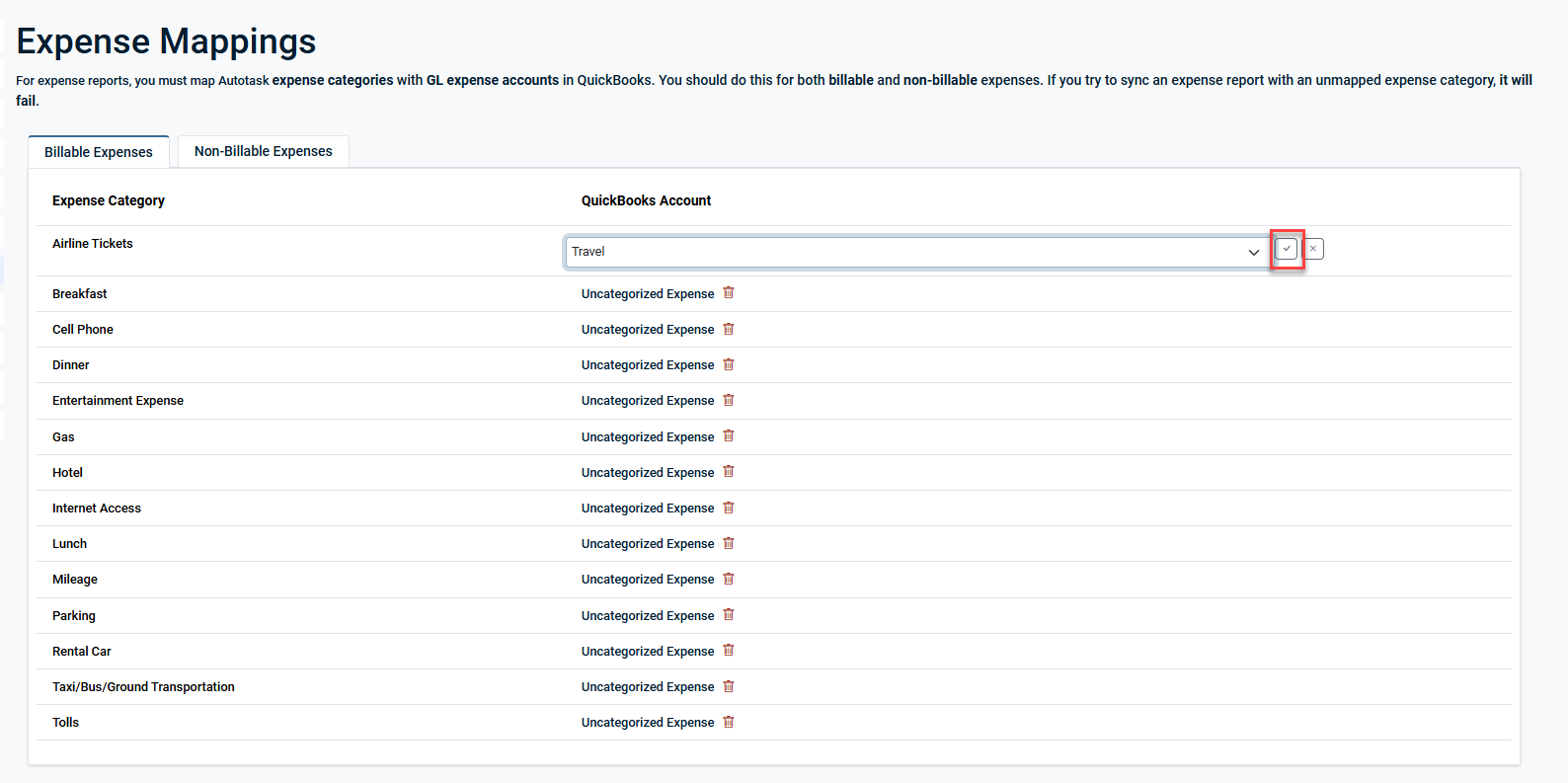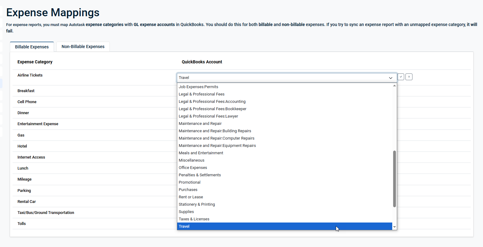 NOTE We recommend mapping both Billable (Reimbursable) and Non-Billable (Non-Reimbursable) Expenses. Unmapped Expense Categories will not sync to QuickBooks.