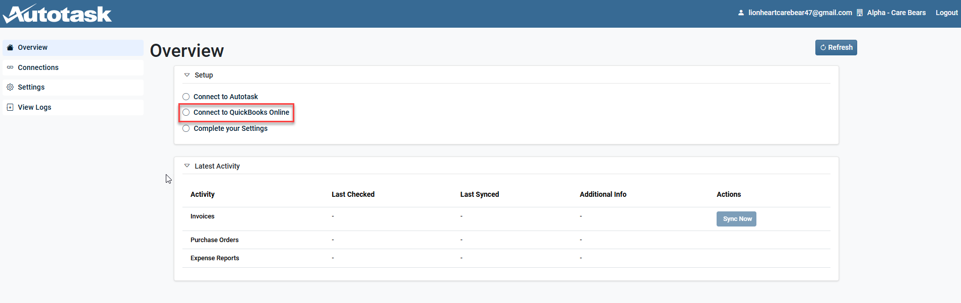 Disconnect your current Autotask QuickBooks Online Integration. It is recommended to pause all automatic syncing capabilities from within the legacy QuickBooks Online integration. Refer to Disconnecting the current Autotask/QuickBooks Online integration for more information.