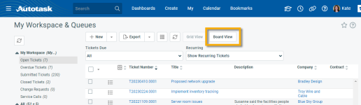 We've also added the ability to use the Board view from the My Workspace and Queues page. There is no additional security for this view. If a resource is able to use the board view, it will be available to them from widget drill-down grids and the My Workspace and Queues page.