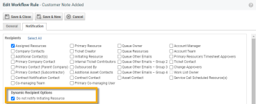 We've added the ability to disable notifications from workflow rules to the initiating resource. On the Notifications tab of a workflow rule, you can now select Do not notify initiating resource to prevent the initiating resource from receiving a notification that they would otherwise receive based on the dynamic recipient selections. For example, if a workflow rule is set to fire when a ticket is edited and the workflow rule includes a notification to the primary resource, with this setting selected the primary resource on the ticket will not be notified when they edit the ticket.