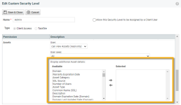 To see all the available fields, navigate to a new or existing Client Access Security Level (Admin > Extensions and Integrations > Client Portal & Taskfire > Manage Security Levels) and in the Asset section, under Display additional Asset details, scroll through the list of Available fields. To make the fields available for viewing by users with that security level, double-click or use the arrows to move the fields to the Selected column.