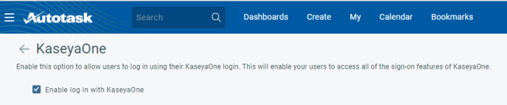 - The Autotask Admin / KaseyaOne Master User can now enable Single Sign-On with one step, by selecting Enable Log in with KaseyaOne.