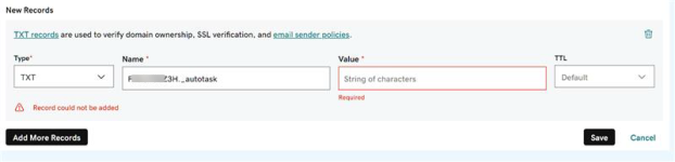 - Add this ID to the domain’s DNS as the Name of a new TXT record. Both Name and Value are required. You can pass any value (a period or space) into the Value field and it will be valid, provided the Name field is populated correctly.