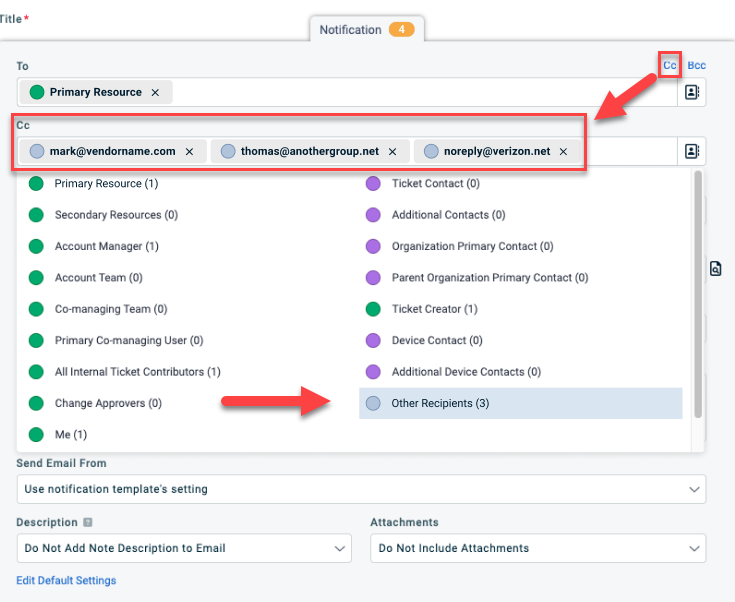 Ermöglicht das Verwalten von CC‑Empfängern (hinzufügen, entfernen, beibehalten) beim Senden von Benachrichtigungen aus dem Ticket. Wenn Sie aus dem Ticket antworten, kann Autotask den ursprünglichen Empfängerkreis der E‑Mail übernehmen. Weitere Informationen finden Sie im Benachrichtigungsbereich.